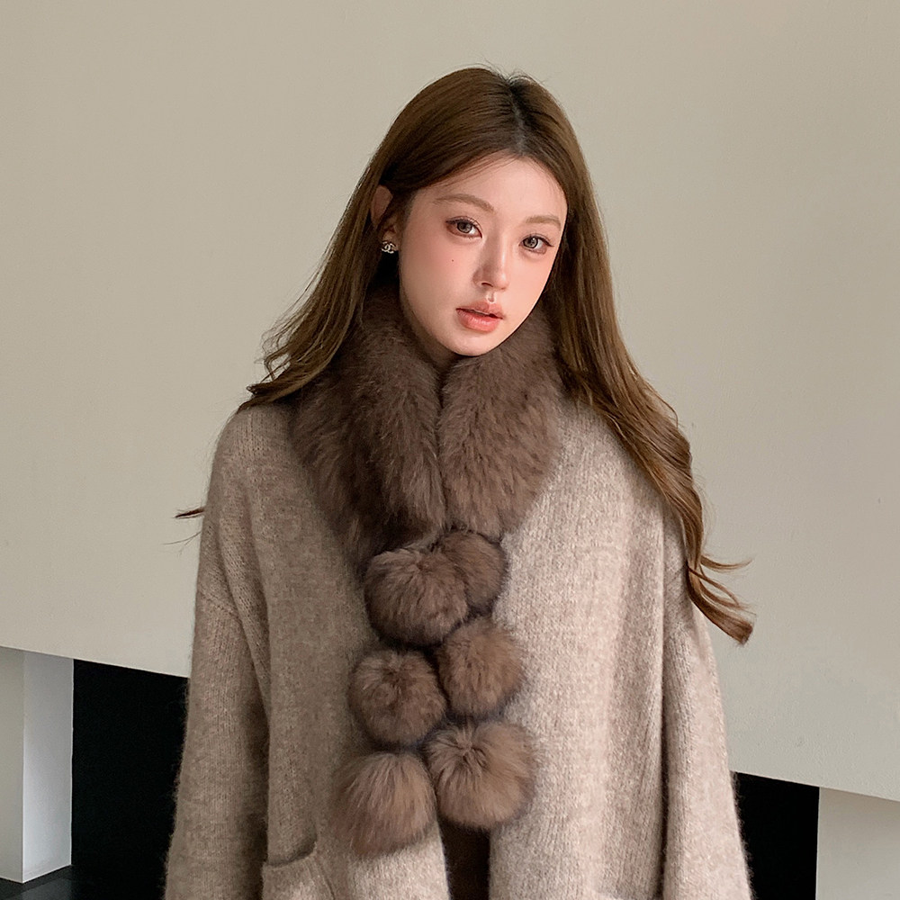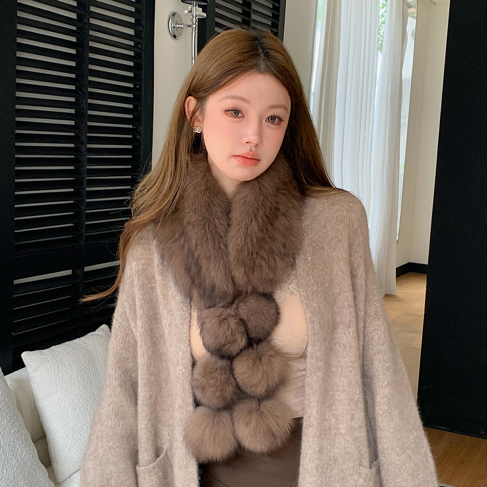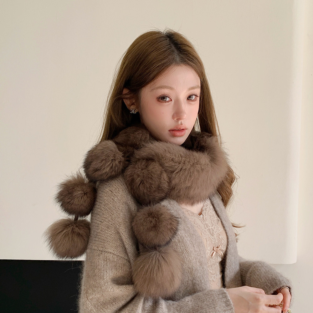 整皮编织双面狐狸毛球球围巾真毛长款围巾韩系皮草真毛毛围脖可爱